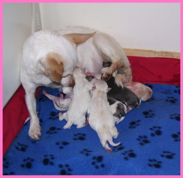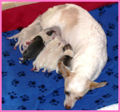 The pups are doing very well. Everyone is gaining weight steadily. Blossom is leaving her pups to eat and go potty and occasionally nap on the bed for a break. She is amazing! Such a great mamma!