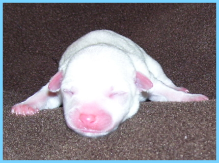 6:15pm: OH BOY! we have a boy! All white, male pup. Appears very healthy. ADORABLE. Fairly uneventful birth. Blossom is doing very well. This big guy is Kale.